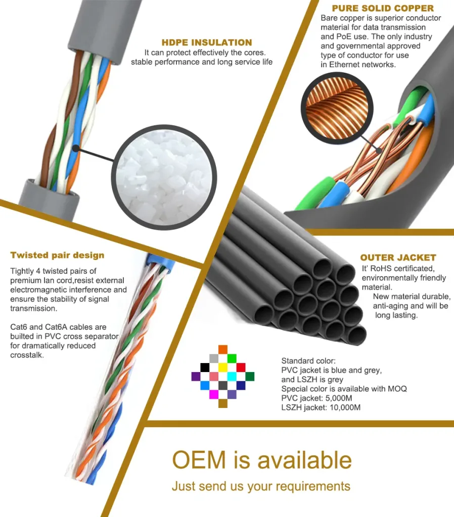 4, HP Series(Highest performance), Compare with HE series,Highest performance cable all choose Pure Copper, and Imported insulation , Jacket materials. This is for customers who have very high requirements for cabling, Fully satisfied Gigabit and 10-Gigabit cabling requirements.