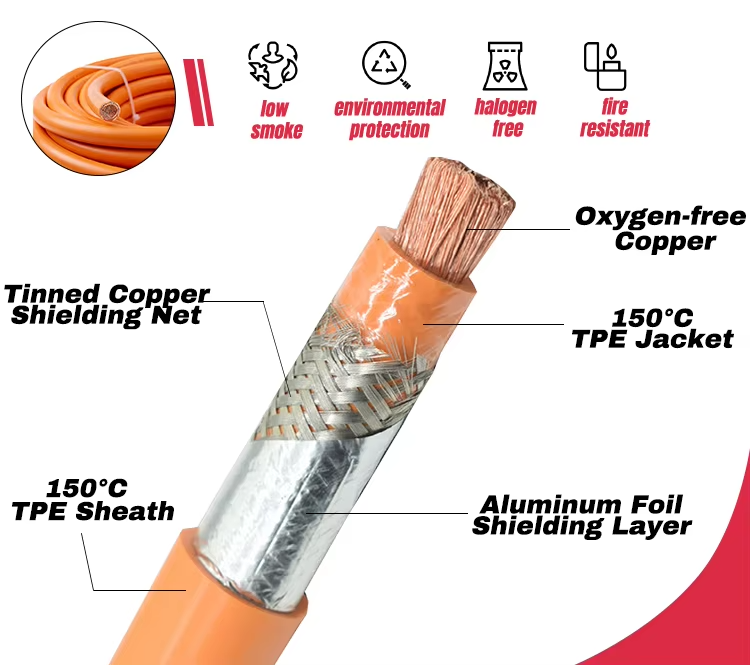 This High Voltage Screened EV Cable is intended for Electric Vehicle battery high voltage system, flexible and easy to bend. This High Voltage electric vehicle screened cable is used for connecting the charging port and the battery, battery inter wiring, the battery, and the engine and other electrical components to carry the electric current power. this type of high voltage electric vehicle screened cable can meet the very high performance for the harsh environment requirements inside the car.