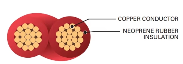 Stranded copper conductors with neoprene rubber insulation. Two conductor wire is twisted with no jacket.